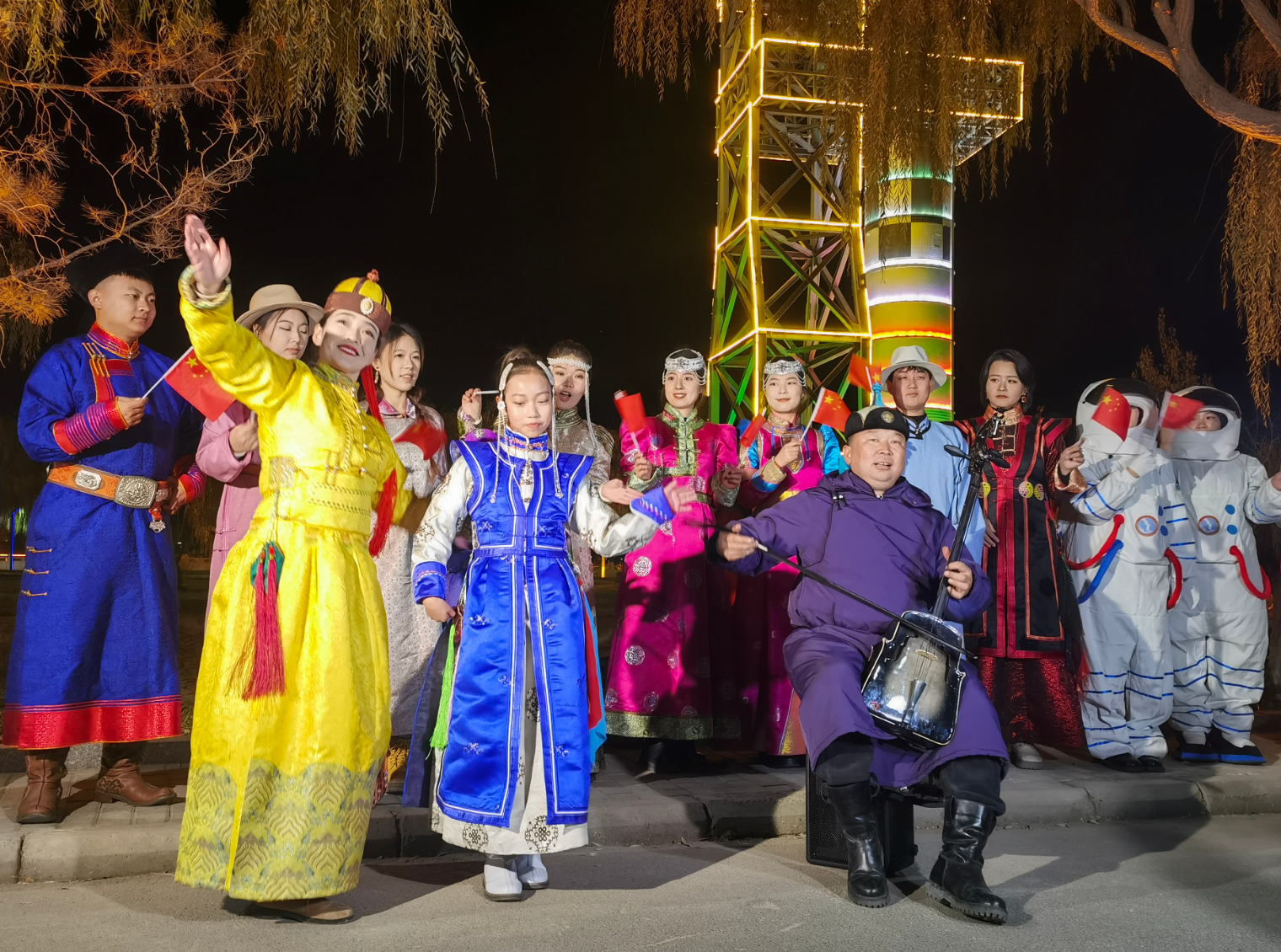 群眾手持五星紅旗載歌載舞歡送航天員。