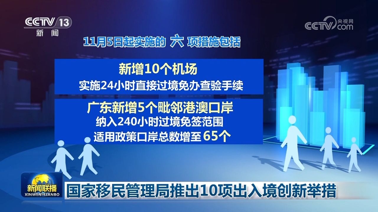 11月5日起開始實(shí)施的6項(xiàng)措施包括:擴(kuò)大往來港澳人才簽注試點(diǎn)至長三角、京津冀全域及全國自貿(mào)區(qū);大陸居民申辦臺(tái)灣探親簽注實(shí)現(xiàn)“全國通辦”;在上海虹橋機(jī)場等多個(gè)口岸推廣“刷臉”智能通關(guān);優(yōu)化河套深港科技創(chuàng)新合作區(qū)跨境流動(dòng)便利;新增10個(gè)機(jī)場實(shí)施24小時(shí)直接過境免辦查驗(yàn)手續(xù);廣東新增5個(gè)毗鄰港澳口岸納入240小時(shí)過境免簽范圍,適用政策口岸總數(shù)增至65個(gè)。