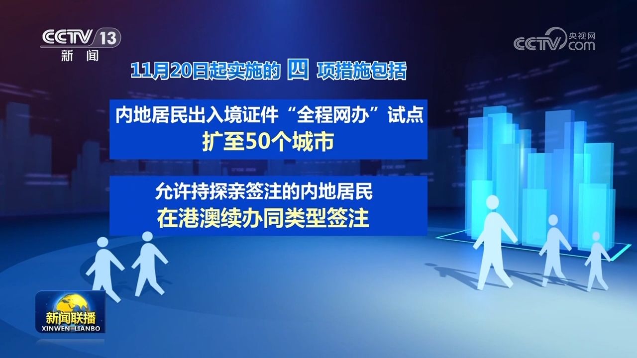 11月20日起開始實(shí)施的4項(xiàng)措施包括:內(nèi)地居民出入境證件“全程網(wǎng)辦”試點(diǎn)擴(kuò)至50個(gè)城市;允許持探親簽注的內(nèi)地居民在港澳續(xù)辦同類型簽注;可簽發(fā)一次有效臺(tái)胞證的口岸由58個(gè)增至100個(gè);外國人入境卡可通過多種線上渠道提前填報(bào)。